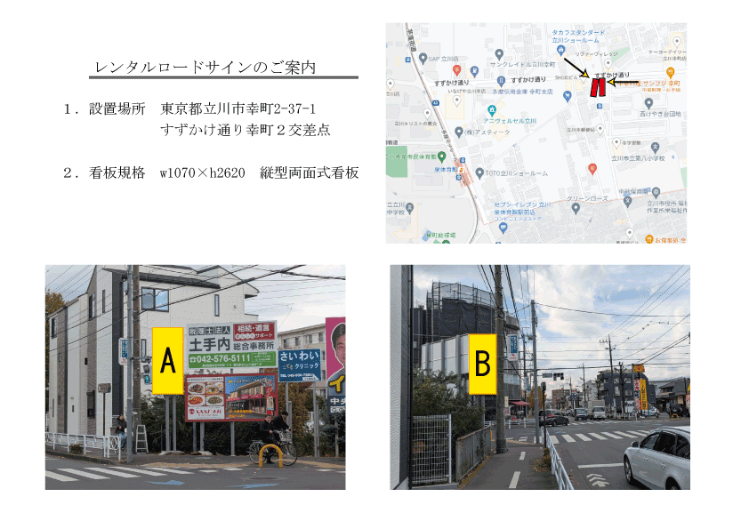 T-TK-10248,10249すずかけ通り幸町2交差点 縦型両面式 物件No.T-TK-10248,10249 物件名すずかけ通り 幸町2交差点 縦型両面式 所在地立川市幸町2-37-1 サイズW(横)1070 サイズH(縦)2620 摘要 ↓画像をクリックすると拡大されます。 クライアントおよび掲出内容、デザイン審査が有ります。 看板の価格、最新空き状況は下記よりお問い合わせください。 ↓お問い合わせはこちらから By artfine | 2025年11月19日 | 未分類 | ← 環八内202406artfine