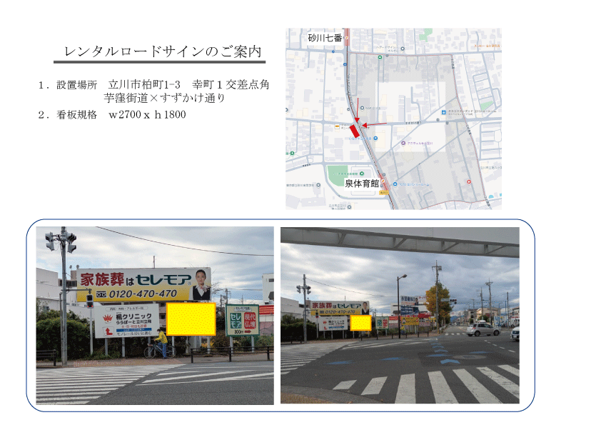 T-TD-20250 立川市 芋窪街道 幸町1交差点 物件No.T-TD-20250 物件名立川市芋窪街道幸町1交差点 横型 所在地立川市柏町1-3 サイズW(横)2700 サイズH(縦)1800 摘要 ↓画像をクリックすると拡大されます。 クライアントおよび掲出内容、デザイン審査が有ります。 看板の価格、最新空き状況は下記よりお問い合わせください。 ↓お問い合わせはこちらから By artfine | 2025年11月27日 | 未分類 | ← T-TK-10248,10249すずかけ通り幸町2交差点 縦型両面式